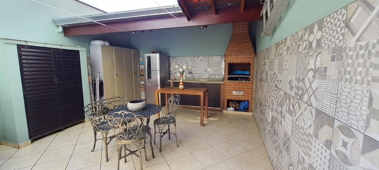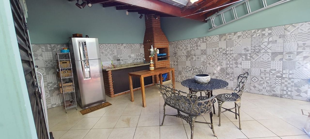 Área de lazer coberta com churrasqueira e pia.